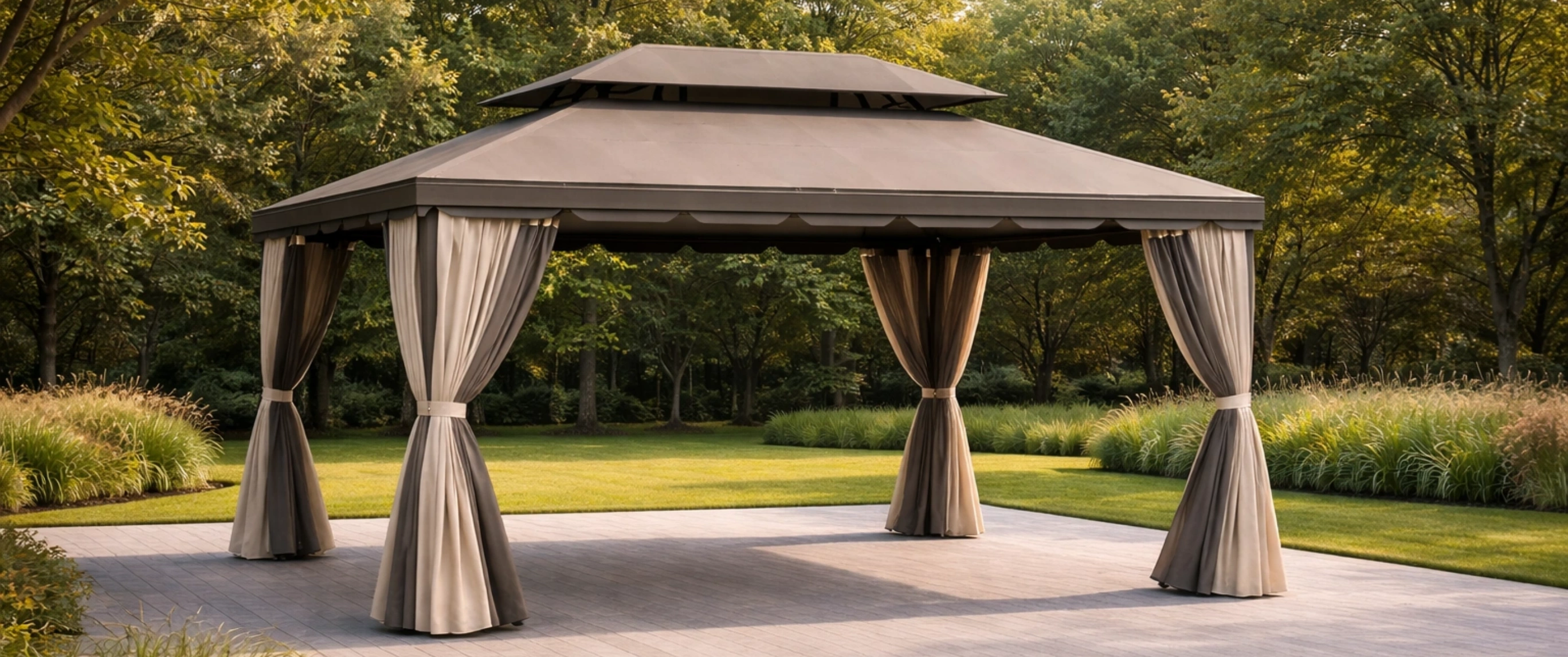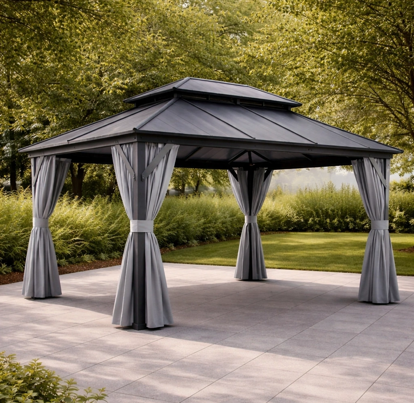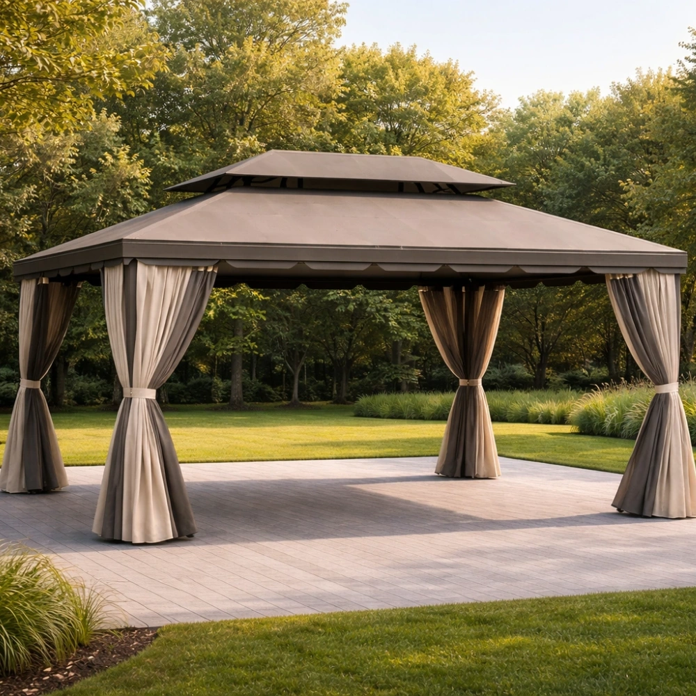 Tonnelle de jardin en aluminium avec toit en acier et rideaux en polyester