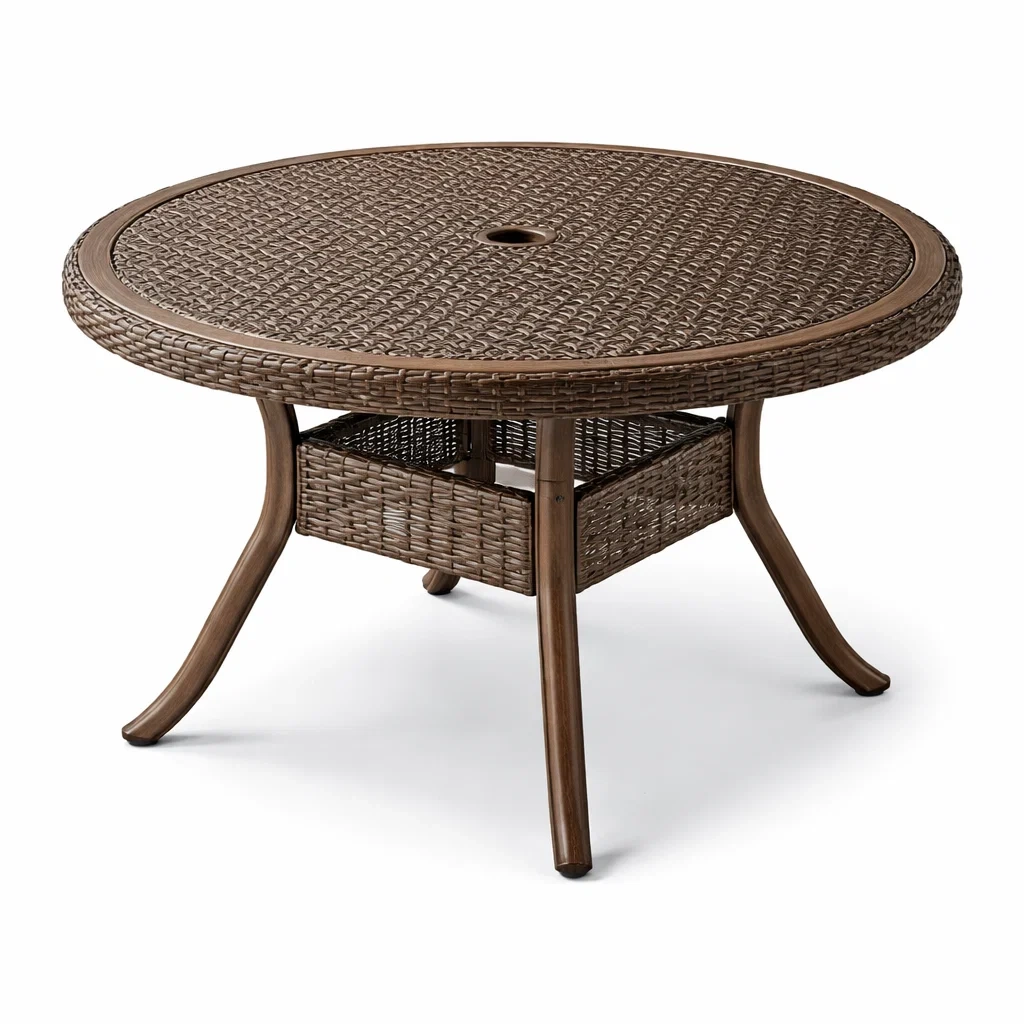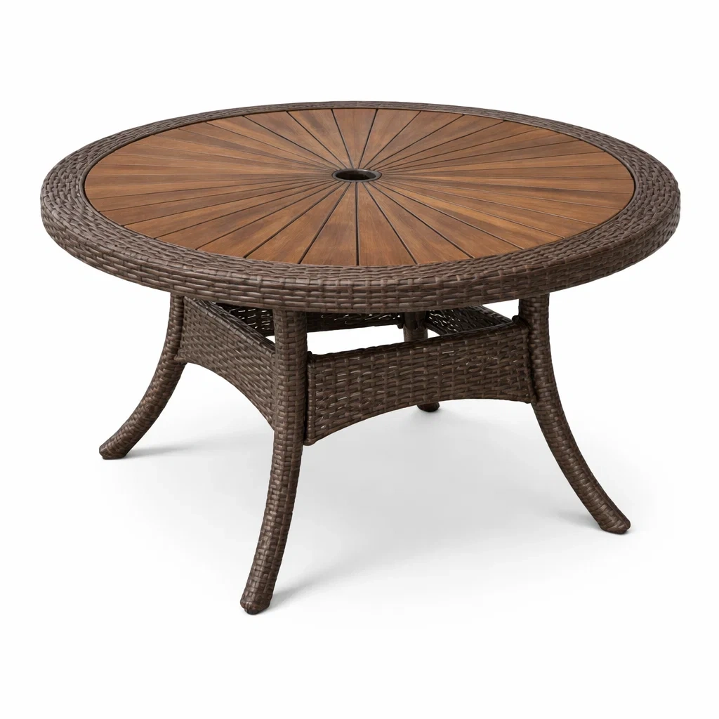 Table de jardin ronde en bois et résine tressée brun
