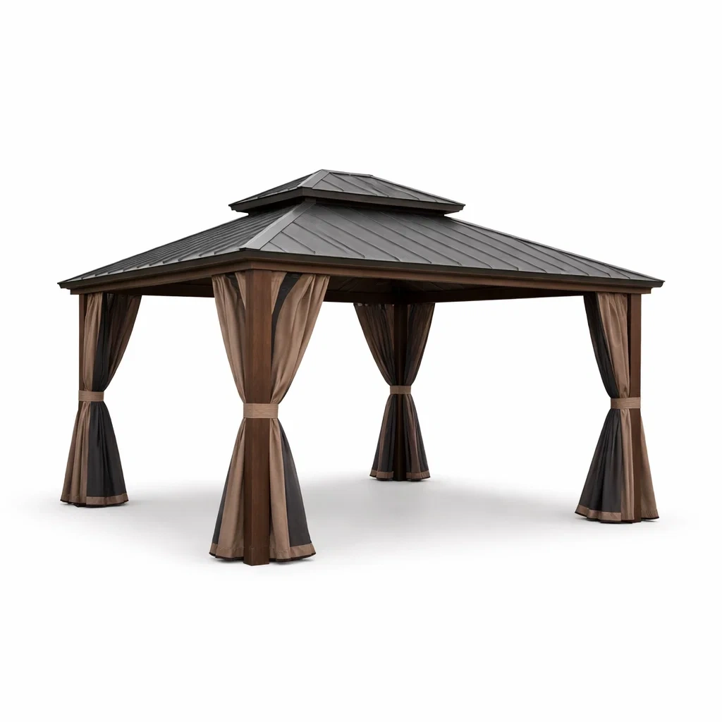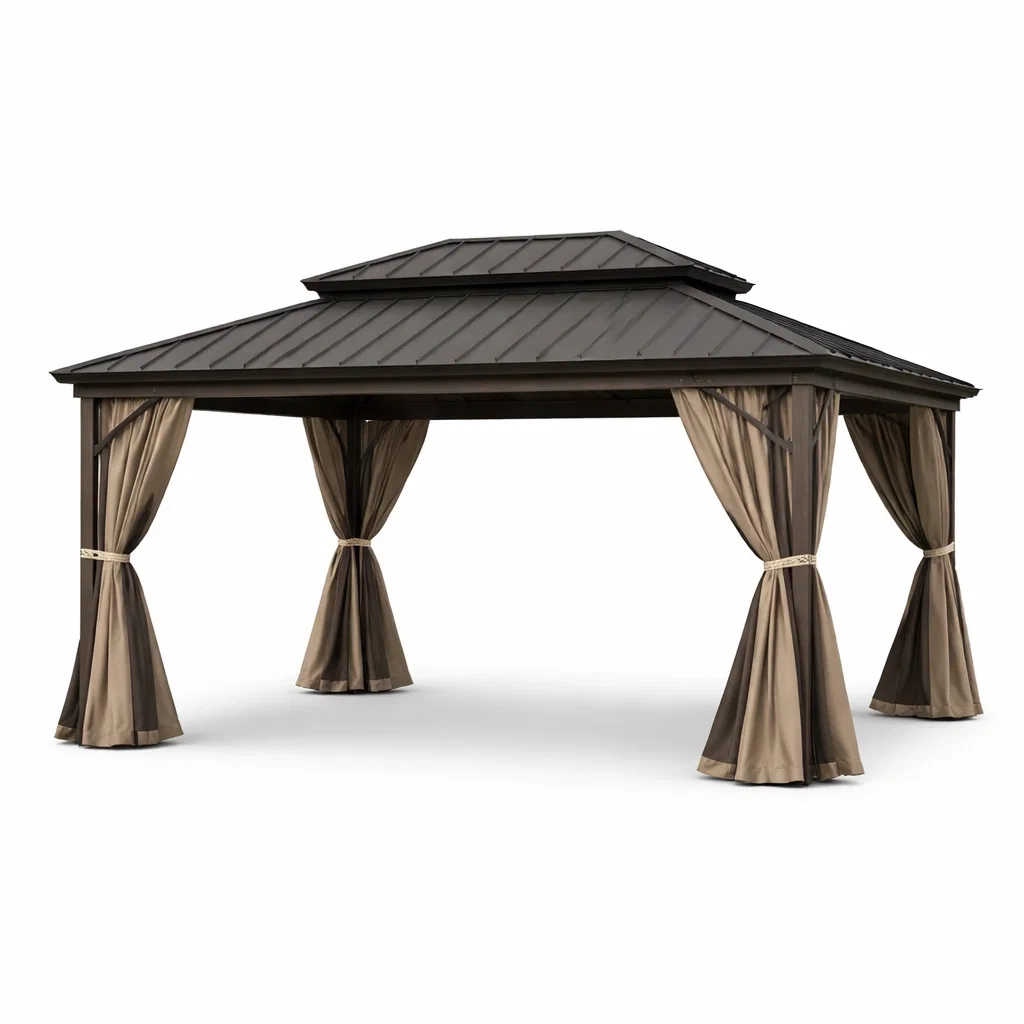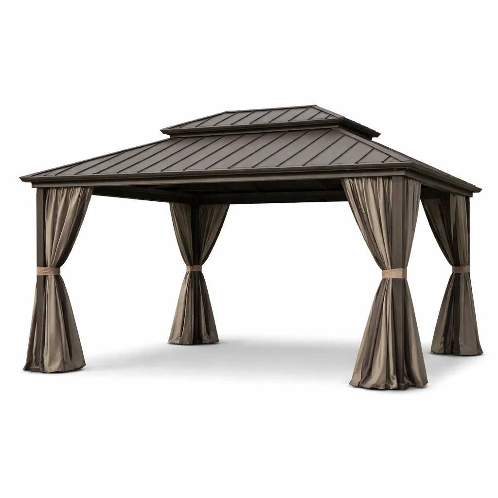 Tonnelle de jardin en aluminium avec toit en acier et rideaux en polyester