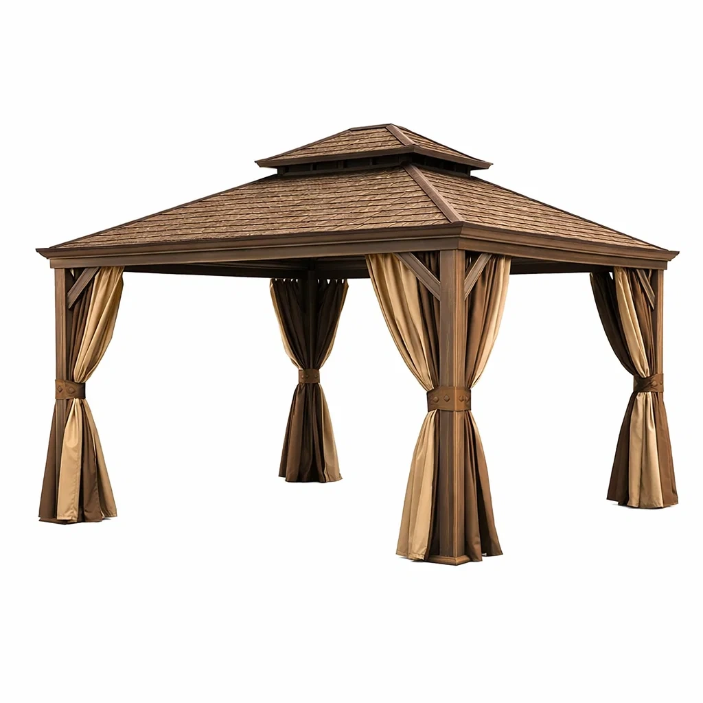Tonnelle de jardin en bois et aluminium avec rideaux en polyester