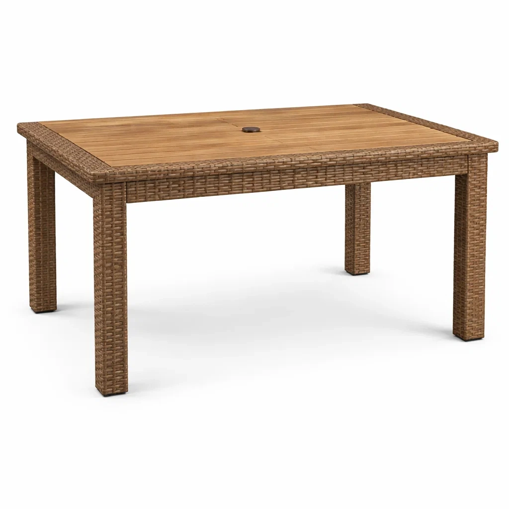 Table de jardin conçue pour l'extérieur en rotin polyéthylène et bois de teck.