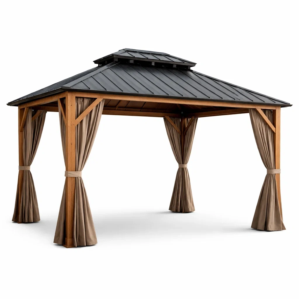 La structure est en bois de cèdre massif, offrant une stabilité et une durabilité optimales. Le toit est en aluminium galvanisé résistant aux intempéries. Les rideaux sont en polyester, procurant une protection contre le soleil avec un indice UV de 50+.